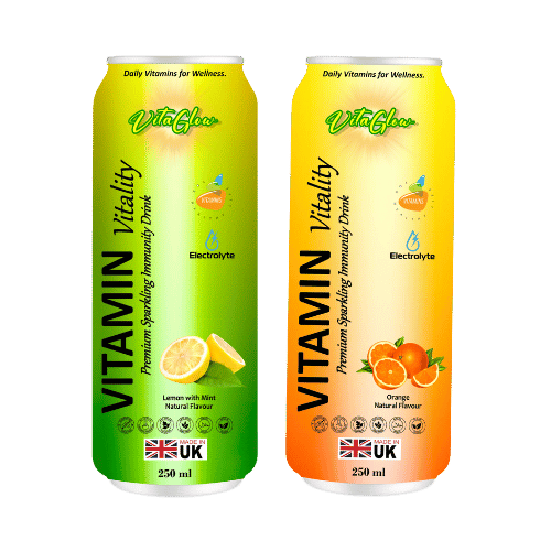 VitaGlow Vitamins & Minerals is a functional beverage developed to support immunity, hydration and daily vitality with a clean blend of essential Vitamins, Minerals, and Natural Electrolytes. Enriched with Vitamin C, D and a B-complex blend, plus complementary nutrients like Magnesium and Zinc, it helps combat fatigue and keep your body in balance. Naturally sweetened with Stevia and infused with refreshing citrus flavors—Orange and Lemon with Mint—this sparkling drink offers a revitalizing boost without the Sugar or Artificial Additives.